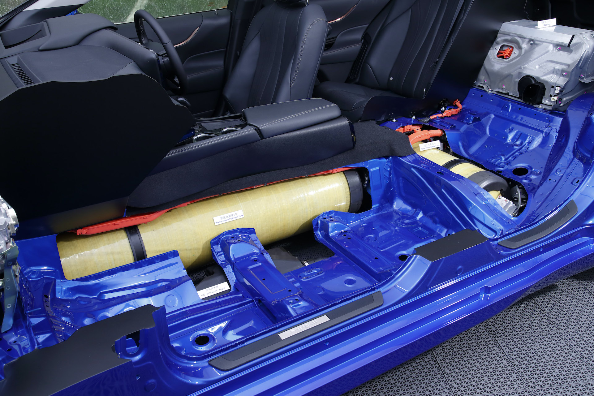 The hydrogen tanks are arranged in a T-configuration with the longest one mounted lengthwise and running centrally under the vehicle floor. The two smaller hydrogen tanks are located laterally in the area under the rear seat and luggage compartment as can be clearly seen in the attached images. Together, the three tanks can hold 5.6 kg of hydrogen – in the first-generation Mirai it was 4.6 kg in two tanks. The position of the hydrogen tanks contributes to the lower centre of gravity of the car and does not take up luggage space. The lightweight hydrogen tanks have an even stronger multi-layer construction. Toyota was able to increase body stiffness by adding strategically placed reinforcements and increasing the use of body adhesives and laser screw welding.